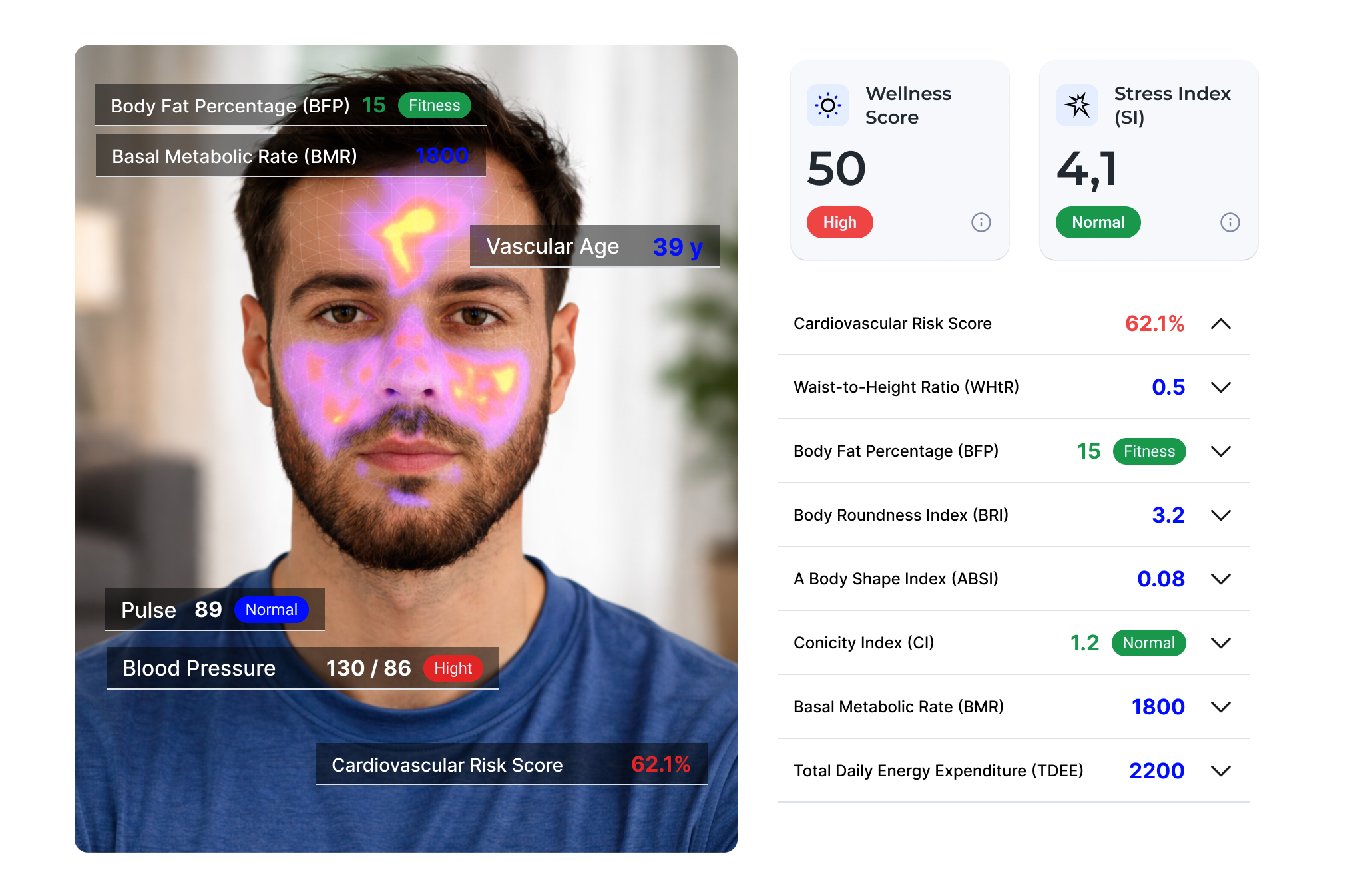 The system analyzes real vital health indicators through modern AI-powered MedTech solutions — covering 50+ measurable parameters.